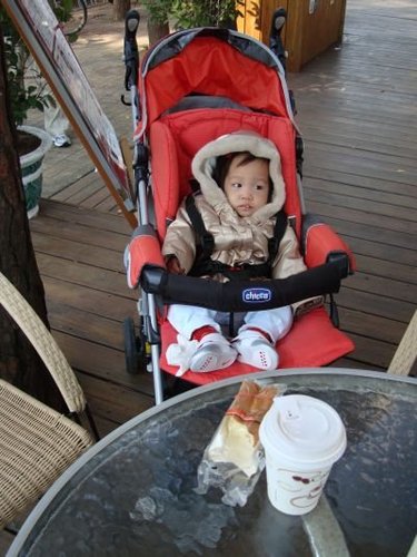 一副意興闌珊想睡覺的樣子。。我們一家三口在戶外的簡易咖啡廳喝陽春下午茶。。